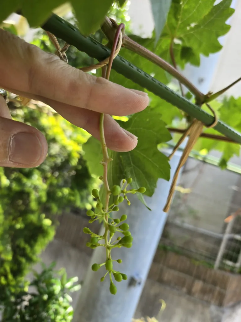 鉢植えで種無しシャインマスカット作りにチャレンジしていたのですが、鉢に1つだけできていた花芽が強風で吹っ飛びました(涙)。