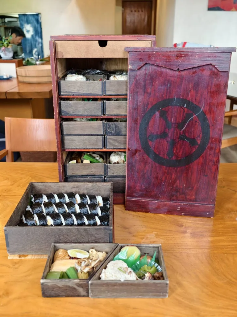 昔は、歌舞伎の日に各家庭がこの大きなお弁当箱いっぱいに料理を作り、親戚や友人に振る舞ったそうです。
