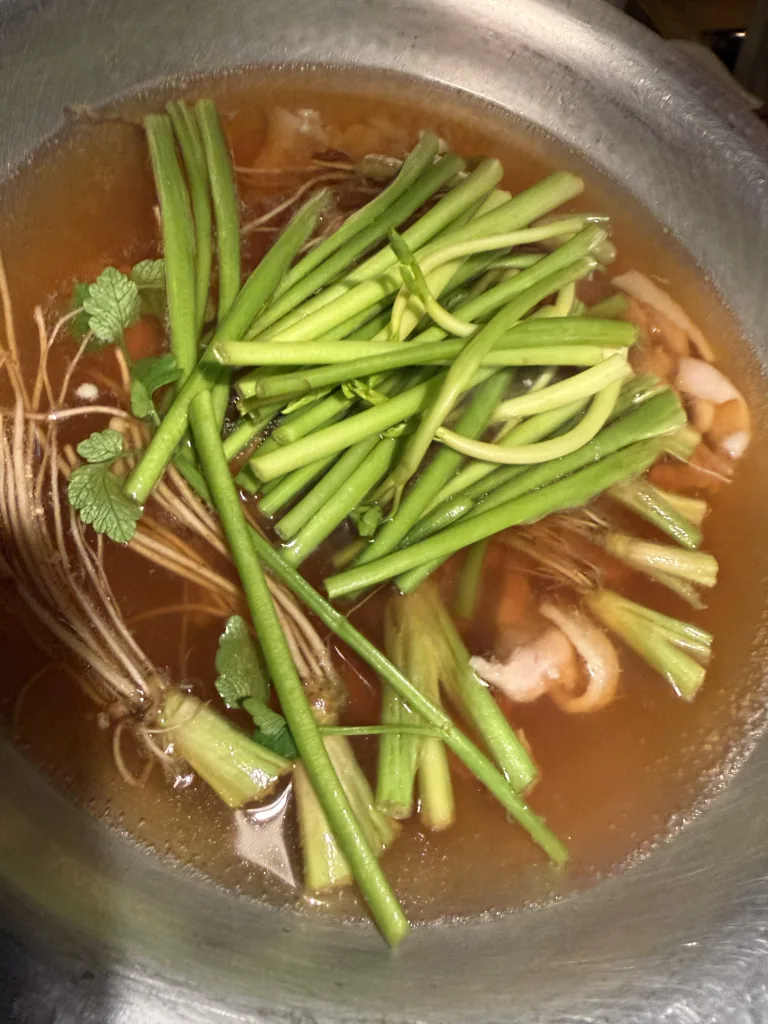 まず肉を入れた後、せりの根、茎、葉と火が通りにくい順に鍋に入れていきます。