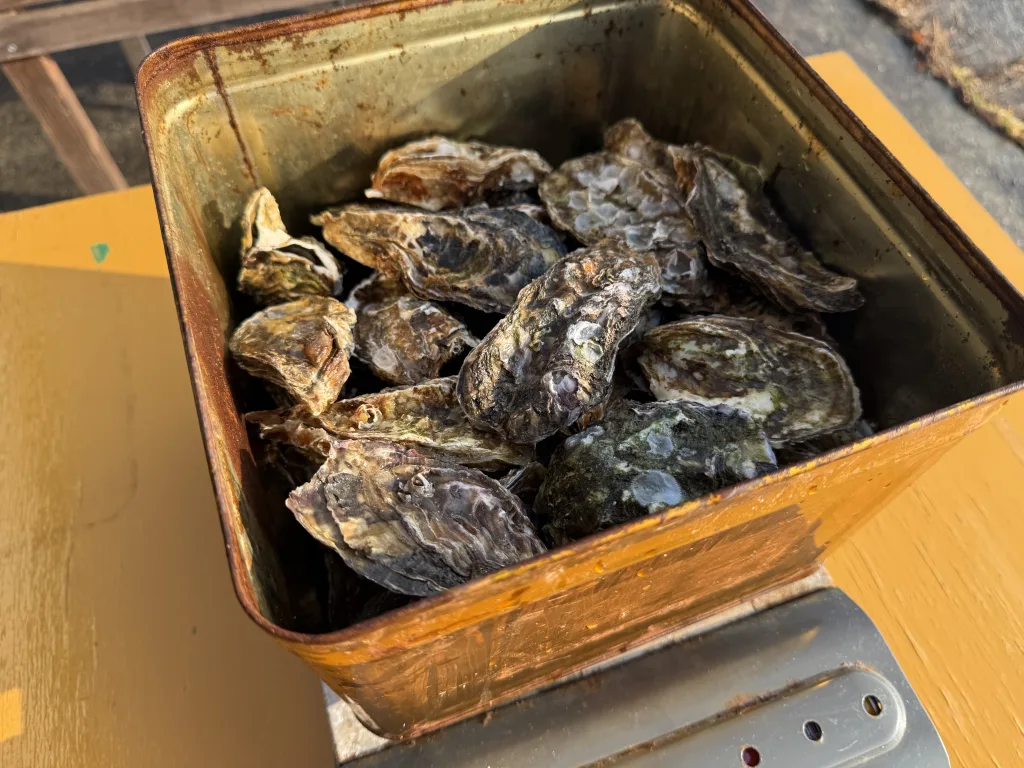 ぎっしりと牡蠣が詰まった一斗缶が登場。3kgちょっと入ってます。