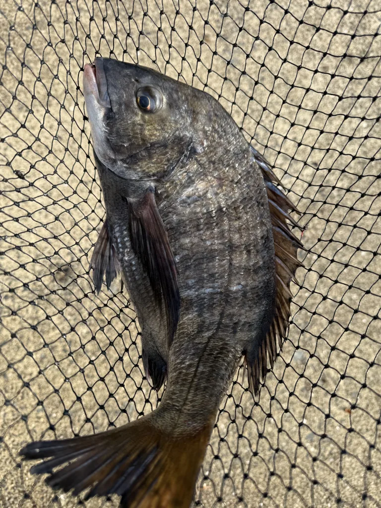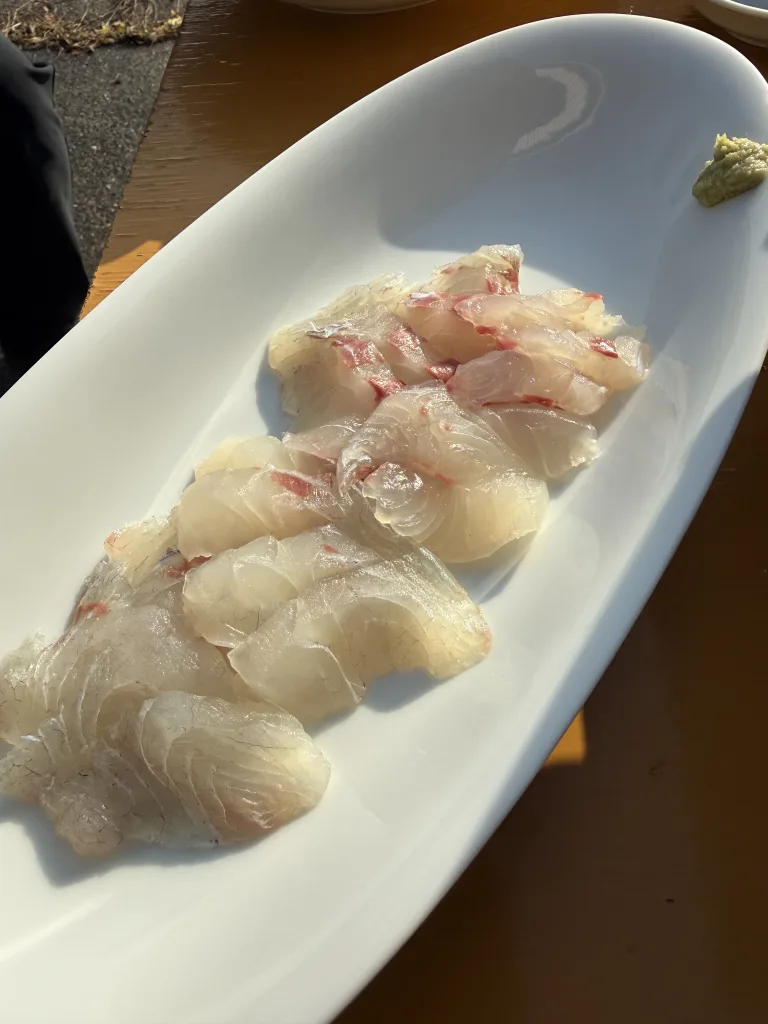 途中で漁師さんが持ってきた採れたての黒鯛を持ってきてくれました。