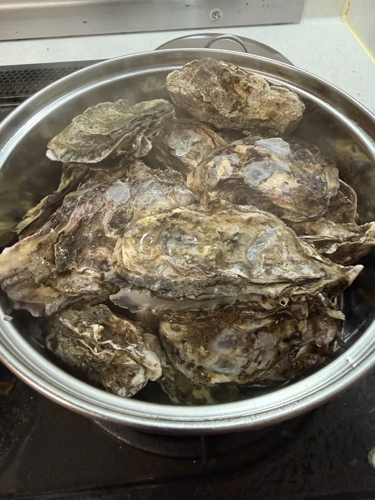 お土産にいただいた牡蠣を自宅で酒蒸し&バター焼きにしてみました。